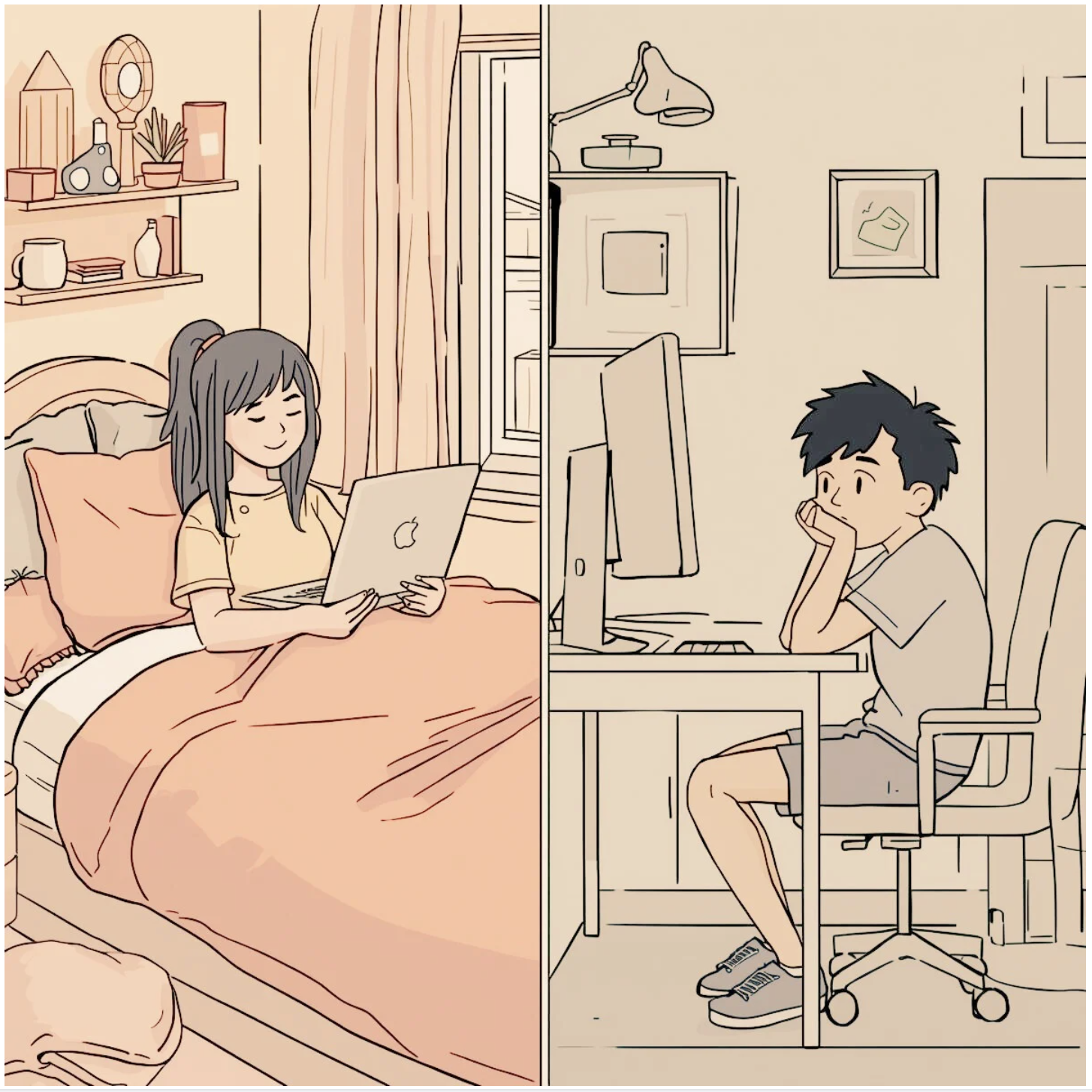 A simple line illustration in muted colours. On the left, a teen girl sits happily on her bed, revising using social media to help. On the right, a young teen boy looks anxiously at his computer screen.
