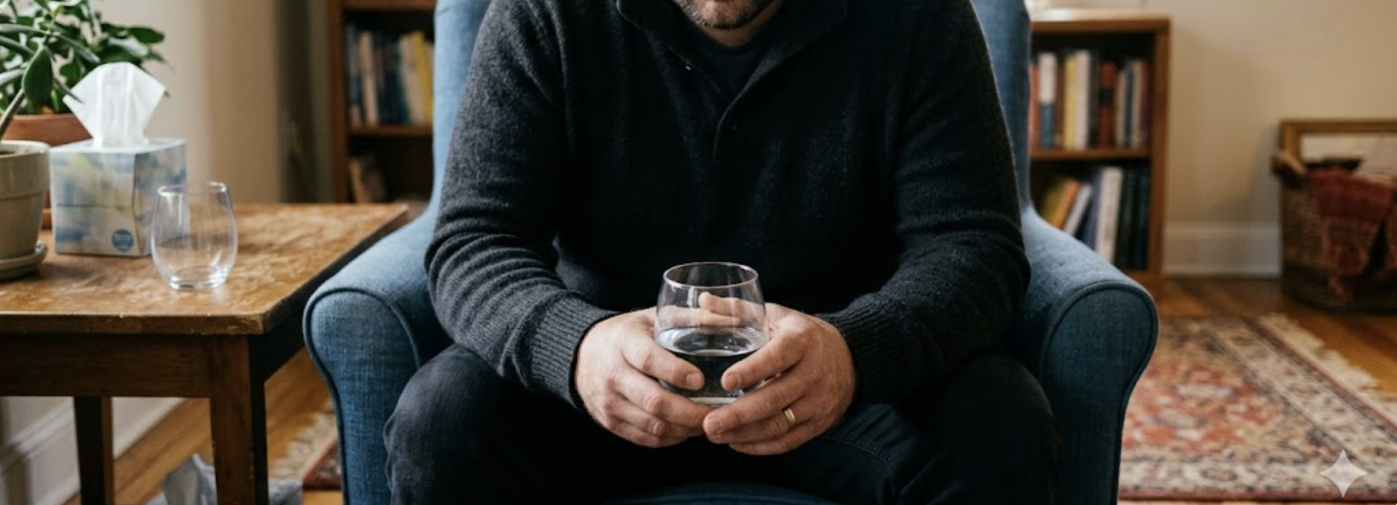 We waited. The silence was thick. He wasn’t in the room anymore; he was in a memory. He shifted, took a sip of water, and cradled the glass, swirling the liquid round and round. His left knee began to bounce, nervous energy spilling over. Suddenly, he set the glass down on the floor by his feet, bypassing the coffee table entirely.